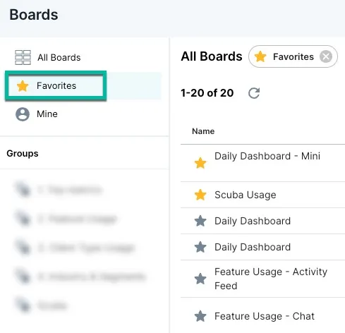 The navigation sidebar for boards allows users to view All Boards, Favorites, boards created by the user (Mine), as well as Groups the user is part of.